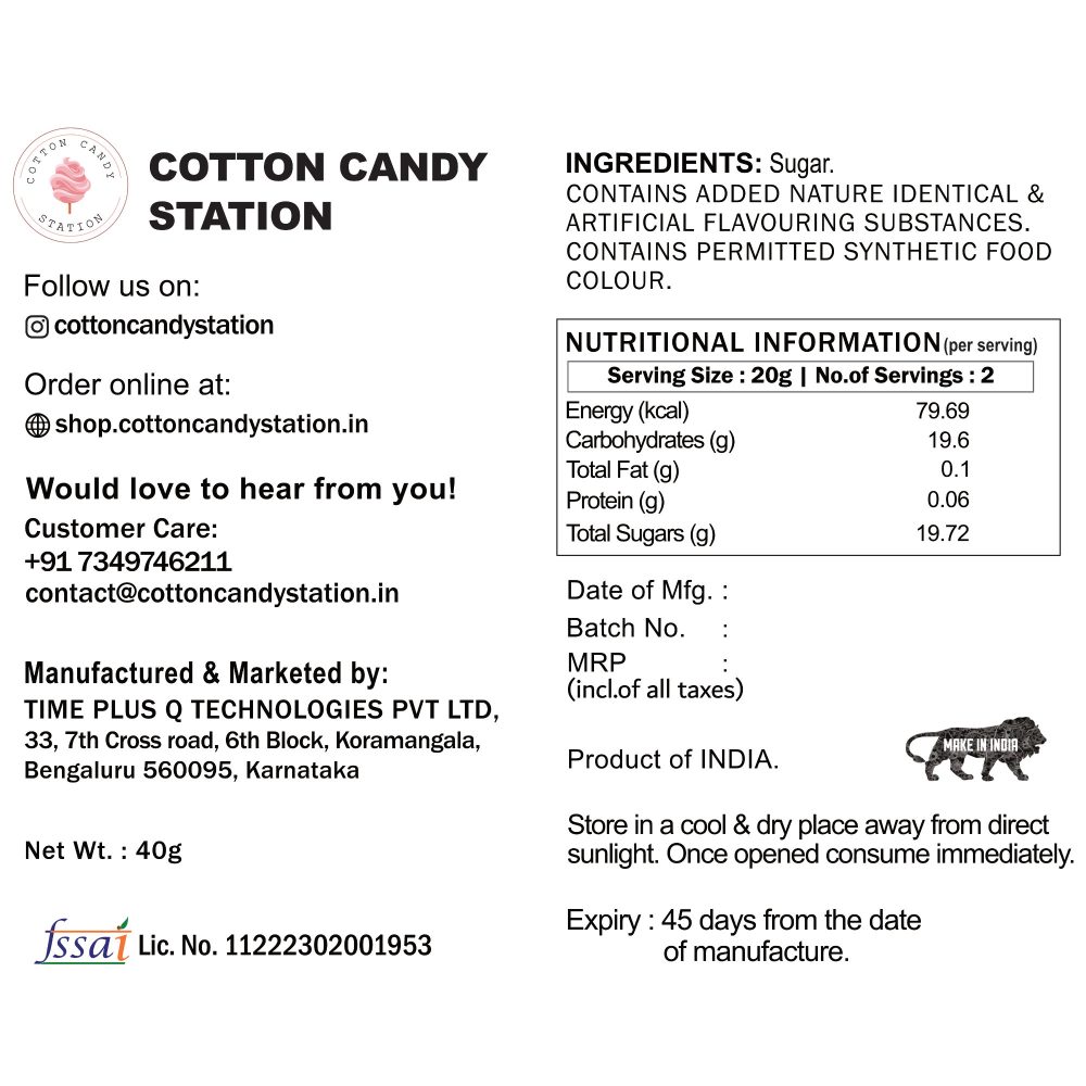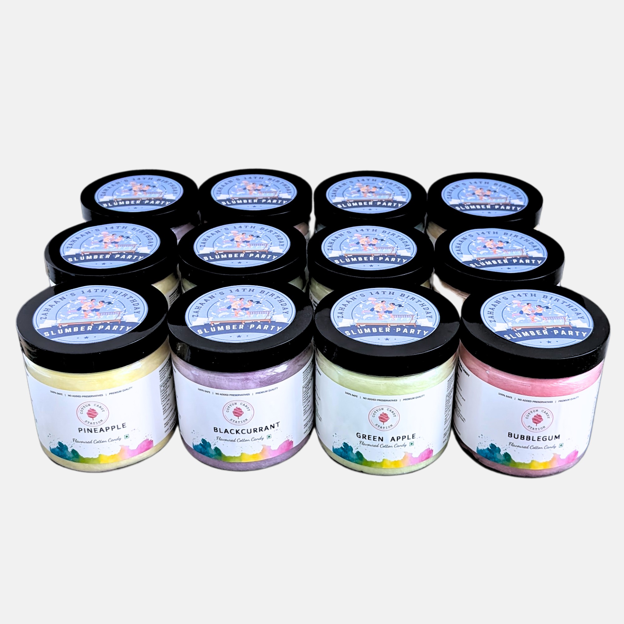 - Premium gourmet cotton candy tubs (40g each) with or without customization stickers